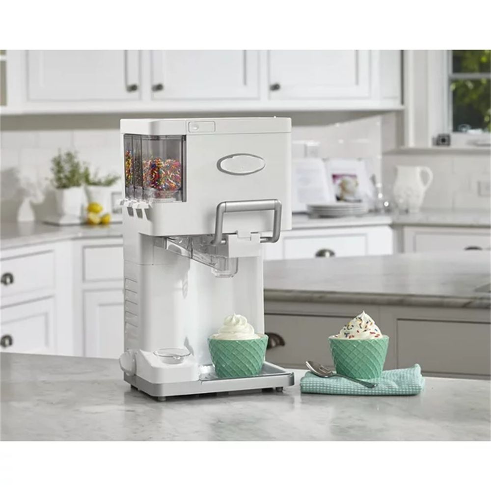 Professional-quality soft ice cream; yogurt; sorbet and sherbet is now available right at home; with the Soft Serve Ice Cream Maker. Not only does it make everyone’s favorites; but with three built-in condiment dispensers; it makes them extra delicious! Just a pull of a tab sends sprinkles; chips and other mix-ins down the chute to mix right into frozen desserts as cones or bowls are filled. Operation is fully automatic; simply pour in the ingredients and turn the dial!