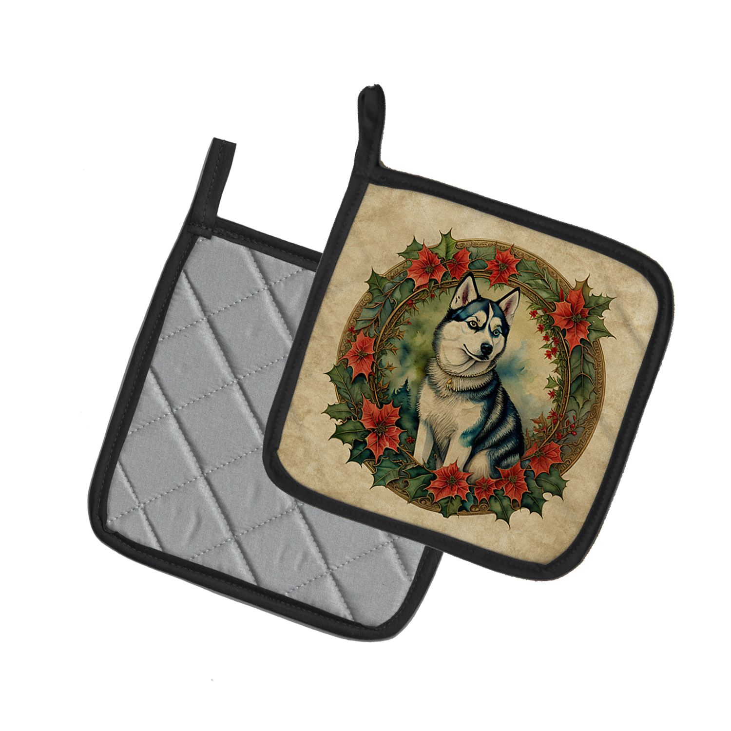 Pair of Pot Holders featuring breed specific Siberian Husky artwork. Celebrate Christmas with this Christmas Pair of Pot Holders. A Pair of Pot Holders to match your kitchen decor. Made in the USA these are thick and functional. Full color artwork decorates the front polyester fabric of the hot pad and accented by a black trim. Use these at as a trivet for your Thanksgiving or Christmas tablescape. Filled with insulated fabric and quilted for durability. These colorful pot holders will make a great gift for your favorite home cook or executive chef. Each pot holder measures approximately 7 1/2 inches by 7 1/2 inches. A hanging tab is included.