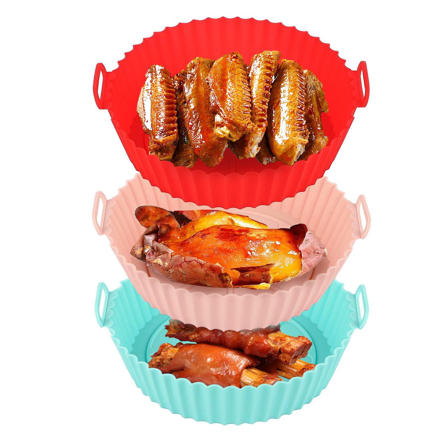 *Wide Applications*:Our package includes 3 round silicone air fryer liners. Reusable silicone bowls for air fryers above 4L and other gourmet cooking equipment,such as microwave ovens,ovens,frying pans,steamers,etc.. perfect for preparing healthy meals at home.