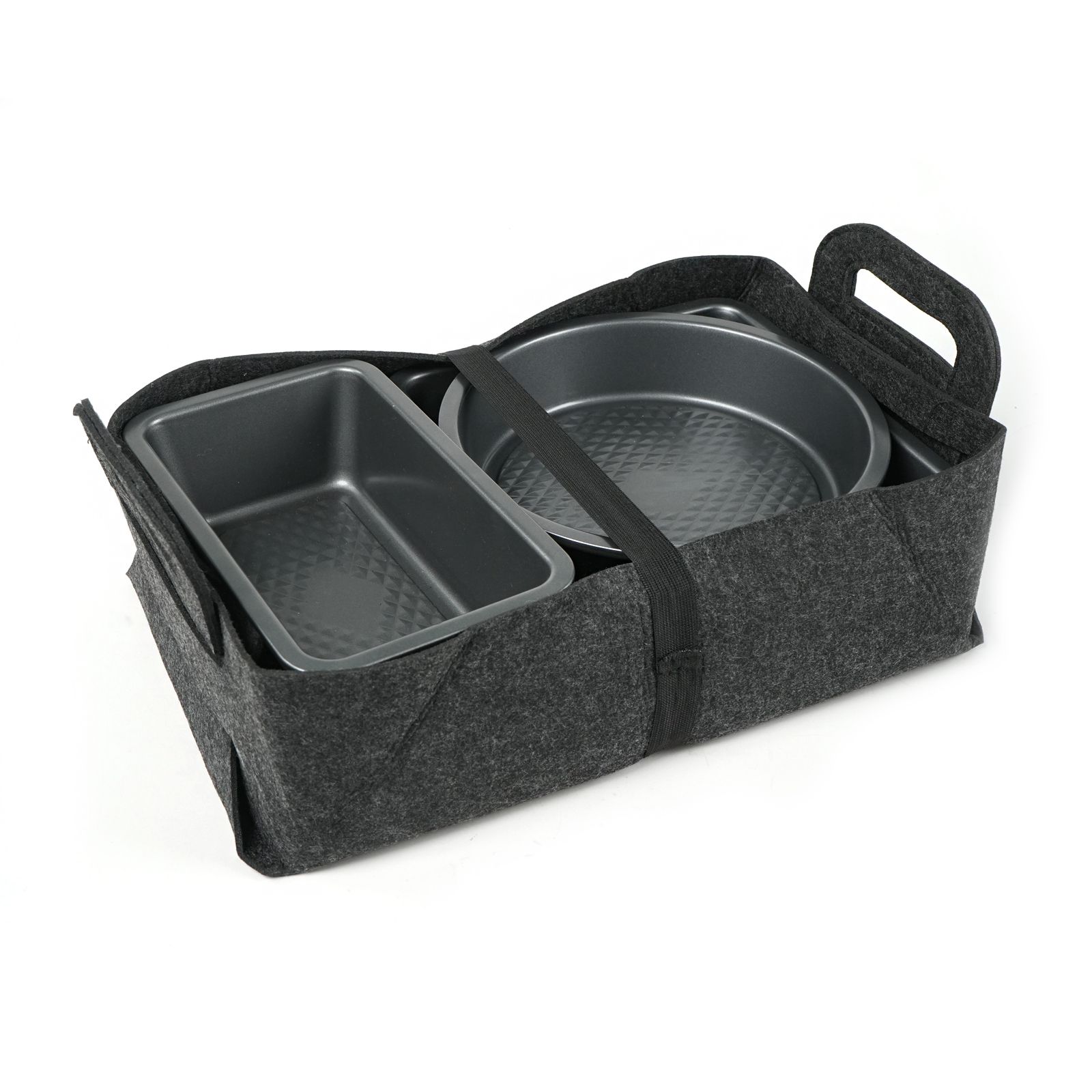 All pieces of our baking set were designed to fit neatly into one another, saving you valuable space in your kitchen cabinets. Utilize the felt storage organizers to keep your bakeware neatly arranged, preventing scratches.