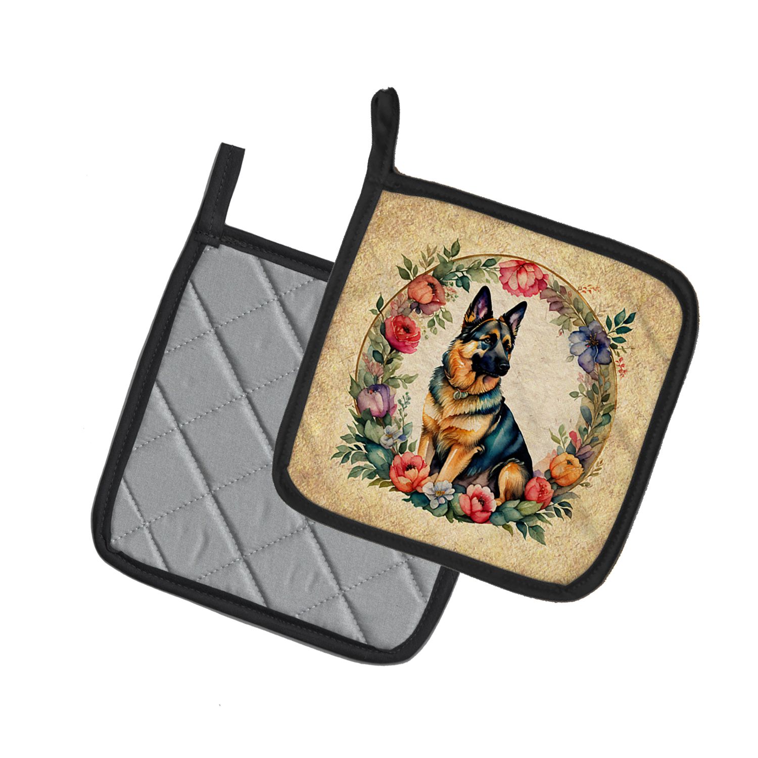 Pair of Pot Holders featuring breed specific German Shepherd artwork. A Pair of Pot Holders to match your kitchen decor. Made in the USA these are thick and functional. Full color artwork decorates the front polyester fabric of the hot pad and accented by a black trim. Use these at as a trivet for your Thanksgiving or Christmas tablescape. Filled with insulated fabric and quilted for durability. These colorful pot holders will make a great gift for your favorite home cook or executive chef. Each pot holder measures approximately 7 1/2 inches by 7 1/2 inches. A hanging tab is included.