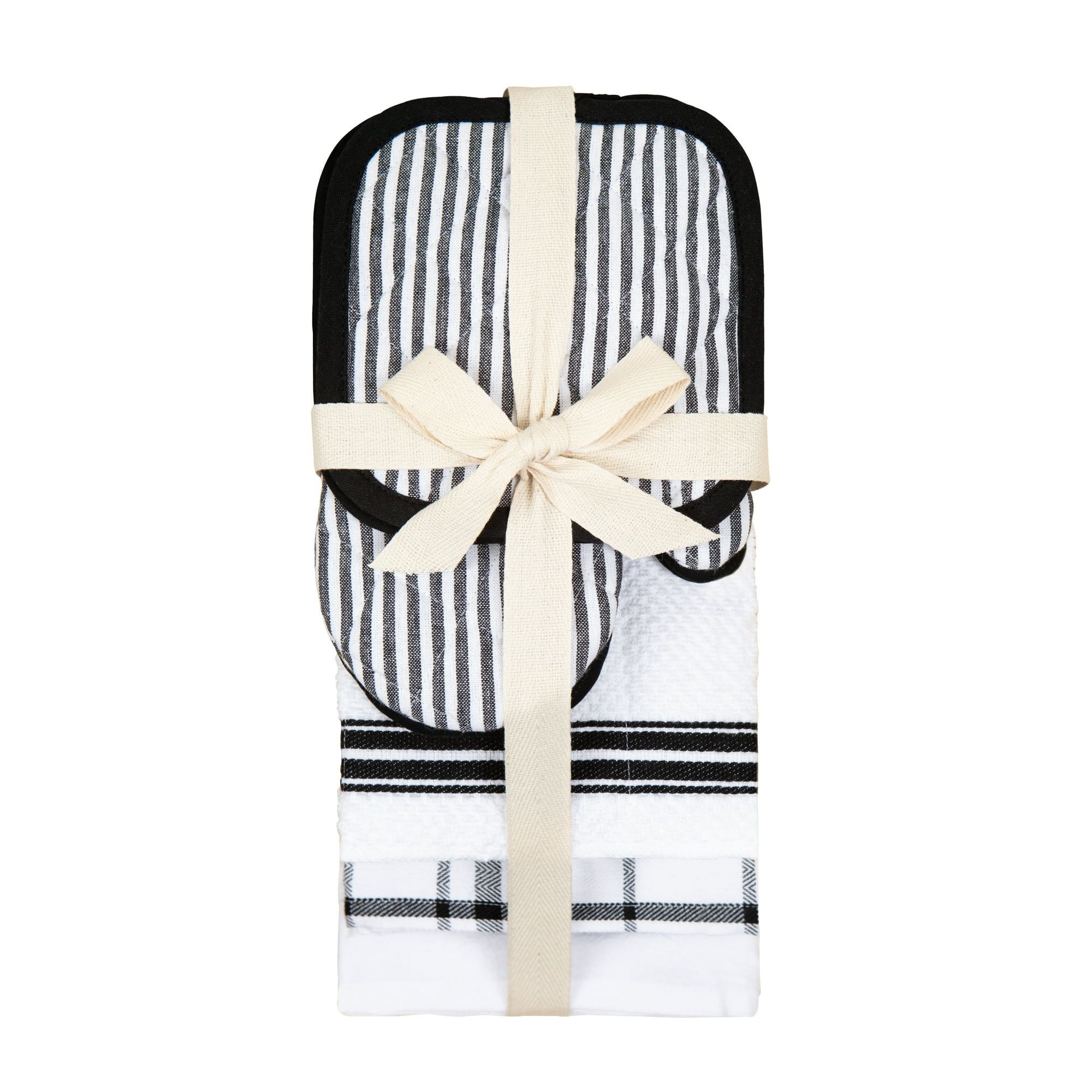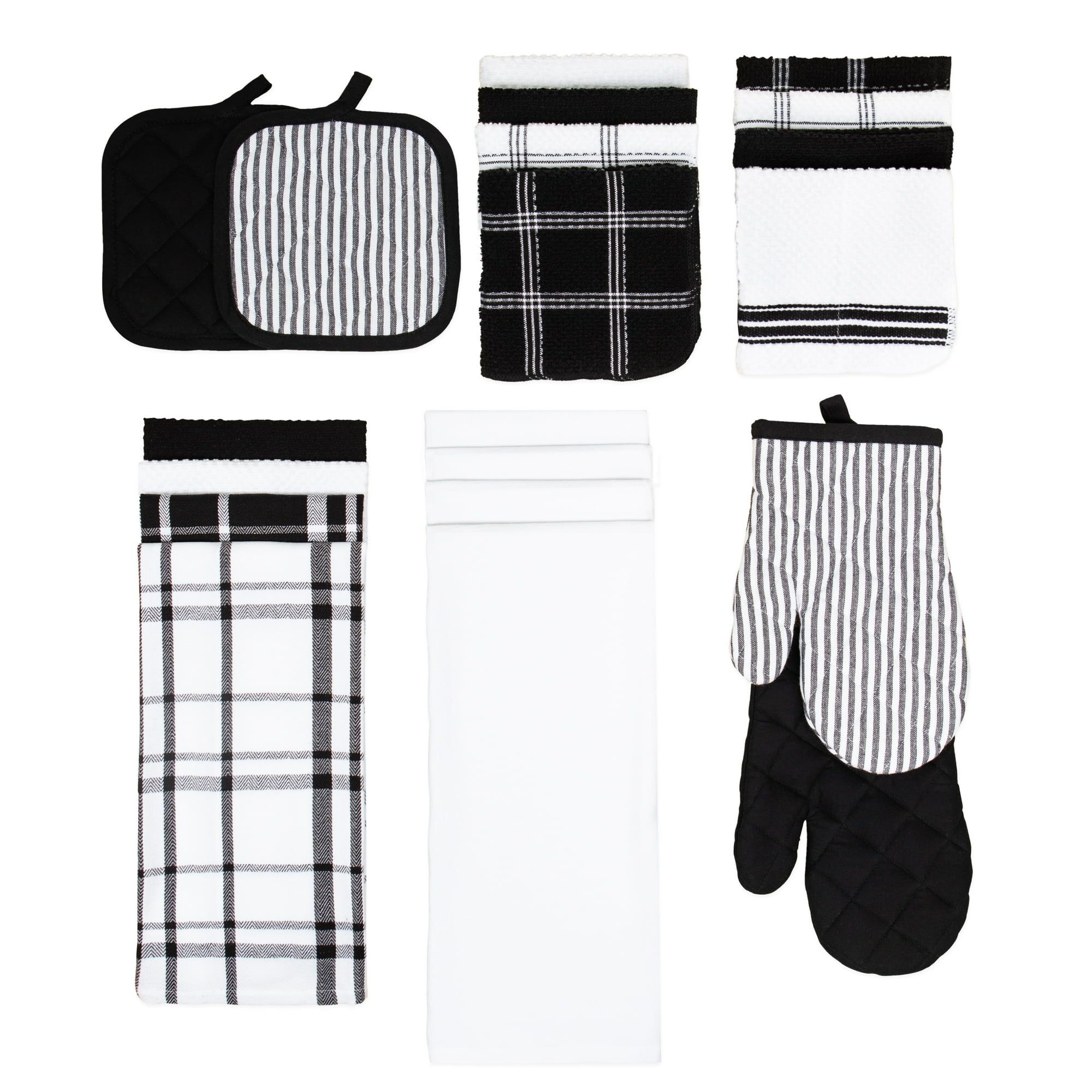 Includes: 2 terry kitchen towels 15" x 25", 2 flat kitchen towels 15" x 25", 4 terry dish cloths 12" x 12", 4 scrubber dish cloths 12" x 12", 4 flour sack kitchen towels 28" x 29", 2 oven mitts 7" x 10", 2 pot holders 7" x 7"Kitchen towels and dish cloths are made from 100% cottonTerry scrubber dish cloths are made from 100% cotton with 100% polyester netOven mitts and pot holders are made with 100% cotton shells and 100% polyester fillTerry kitchen towels, dish cloths, and scrubber dish cloths: machine wash cold with like colors, do not bleach, tumble dry low, remove promptly from dryer, do not ironFlour sack kitchen towels: machine wash cold with like colors, do not bleach, tumble dry low, remove promptly from dryer, warm iron when neededOven mitts and pot holders: machine wash cold with like colors, delicate cycle, do not bleach, remove promptly, lay flat to dry, warm iron when neededAvailable in blue and white or gray and whiteImported