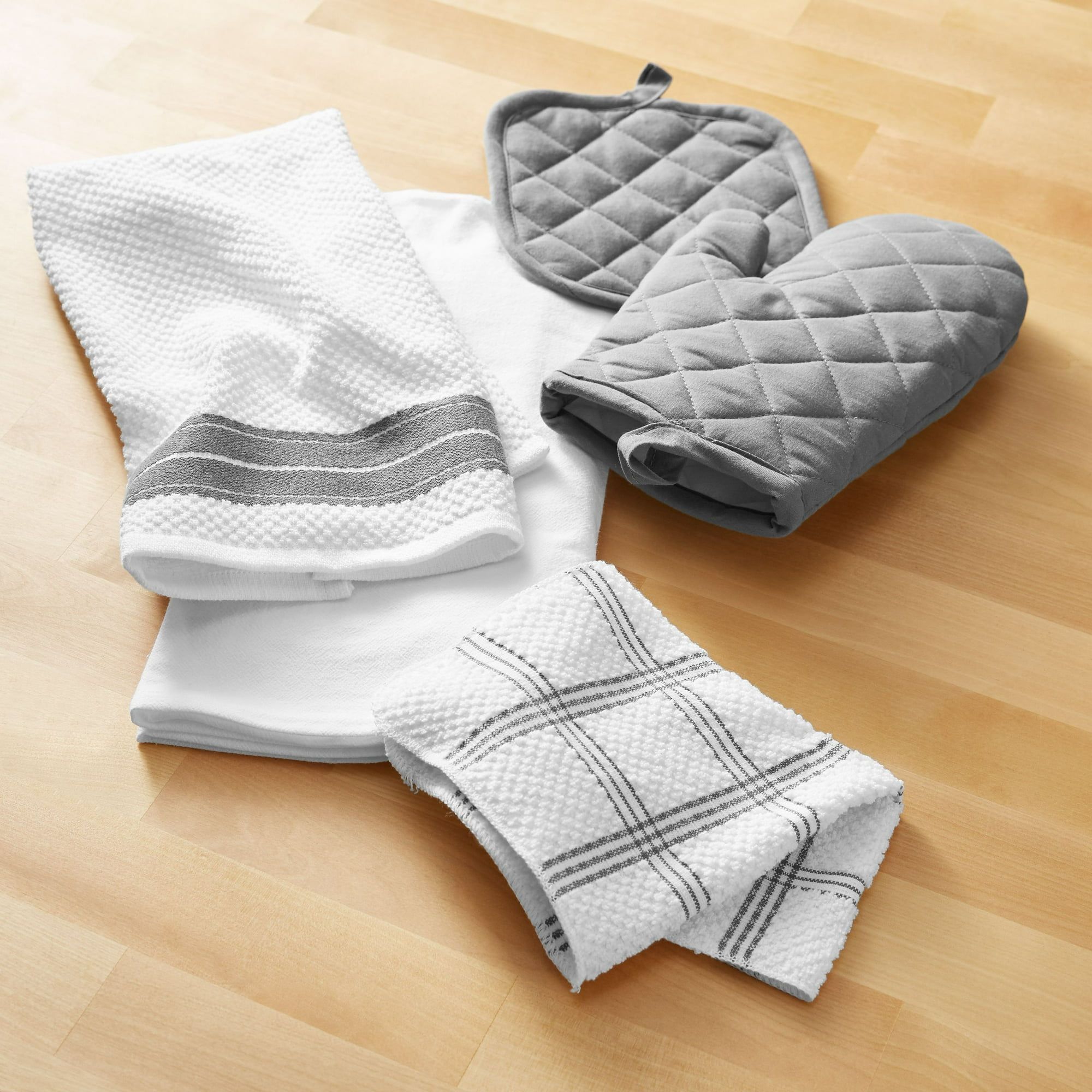 Includes: 2 terry kitchen towels 15" x 25", 2 flat kitchen towels 15" x 25", 4 terry dish cloths 12" x 12", 4 scrubber dish cloths 12" x 12", 4 flour sack kitchen towels 28" x 29", 2 oven mitts 7" x 10", 2 pot holders 7" x 7"Kitchen towels and dish cloths are made from 100% cottonTerry scrubber dish cloths are made from 100% cotton with 100% polyester netOven mitts and pot holders are made with 100% cotton shells and 100% polyester fillTerry kitchen towels, dish cloths, and scrubber dish cloths: machine wash cold with like colors, do not bleach, tumble dry low, remove promptly from dryer, do not ironFlour sack kitchen towels: machine wash cold with like colors, do not bleach, tumble dry low, remove promptly from dryer, warm iron when neededOven mitts and pot holders: machine wash cold with like colors, delicate cycle, do not bleach, remove promptly, lay flat to dry, warm iron when neededAvailable in blue and white or gray and whiteImported