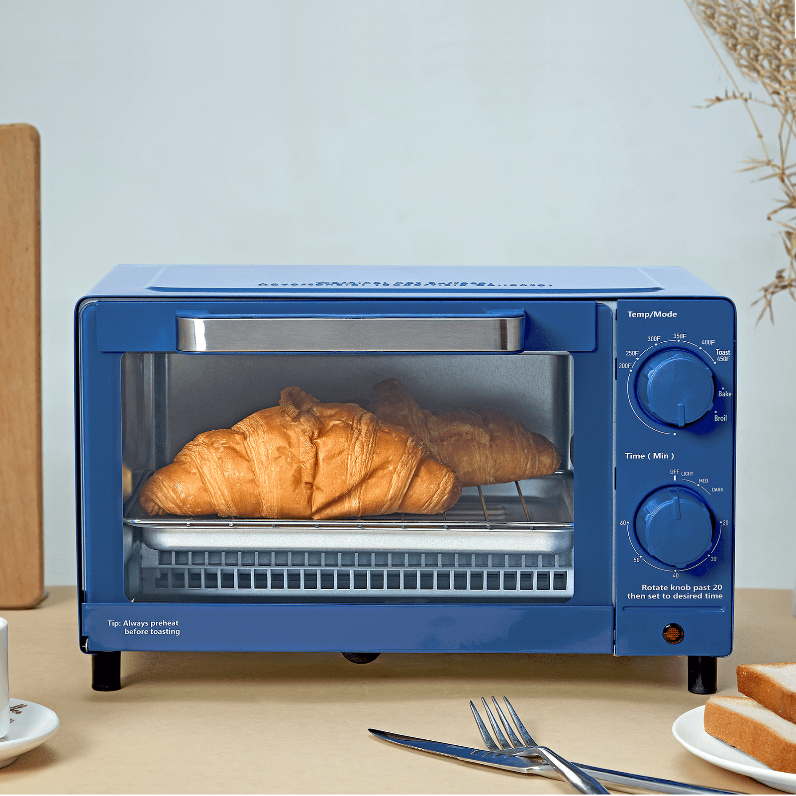 The  4 slice Toaster Oven makes your life more convenient and efficient. It is perfect for preparing toast, sandwiches, pizza, and so much more. This toaster oven can accommodate up to 4 slices of bread or a 9-inch pizza, making it an ideal choice for busy households. The turn dial allows for easy adjustments to temperature mode and time settings, ensuring mealtime is swift and smooth. The compact size of this toaster oven uses less energy and counter space, making it easy to store. The sleek white finish coordinates beautifully with existing kitchen decor and color palettes, ensuring it seamlessly integrates into your home. The baking rack and baking pan are included, and the oven exterior is easy to wipe clean for quick and easy cleaning. The Toaster Oven is sure to become a staple in your home cooking and baking ventures, bringing new experiences to your daily life. With its versatility, time-saving features, and stylish design, this toaster oven is a must-have for anyone looking to elevate their mealtime experience.