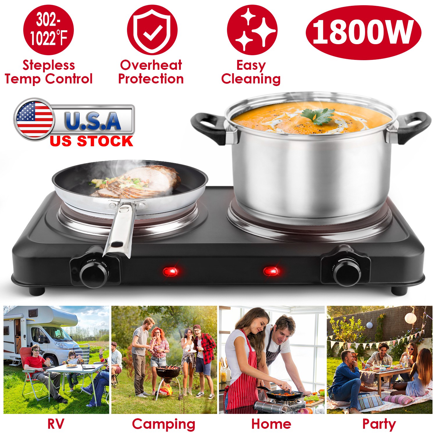 This compact infrared dual burner is great for events and traveling! The lightweight and compact design allows for easy storage and carrying. The hot plate burner with special infrared technology distributes heat quickly and evenly for great performance at 302-1022℉ stepless adjustable temperature. 7.5in-Diameter & 6.3in-diameter glass heating plates make it suitable for most cookware with diameter≤7.5in/6.3in, such as frying pans, woks or stovetop teapots made from aluminum, stainless steel, iron, glass, etc.. Perfect for camping, student accommodation, holiday homes, caravans, campers, offices or as an extra cooking surface in a busy kitchen. A sleek clean black finish adds style and a sleek appearance to this wonderful kitchen addition!