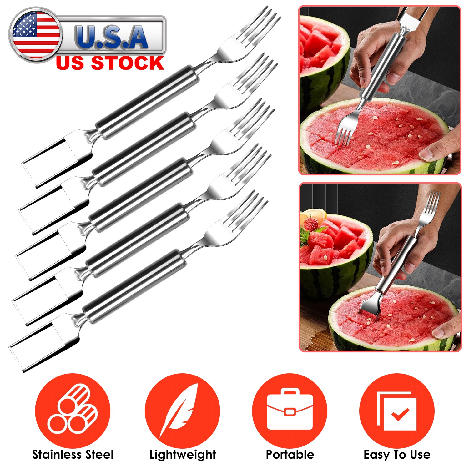 Home > 5Pcs 2 in 1 Watermelon Cutter Slicer Fork Stainless Steel Dual Head Watermelon Fruit Cutting Fork Knife For Summer Family Gathering Friend Party Campi