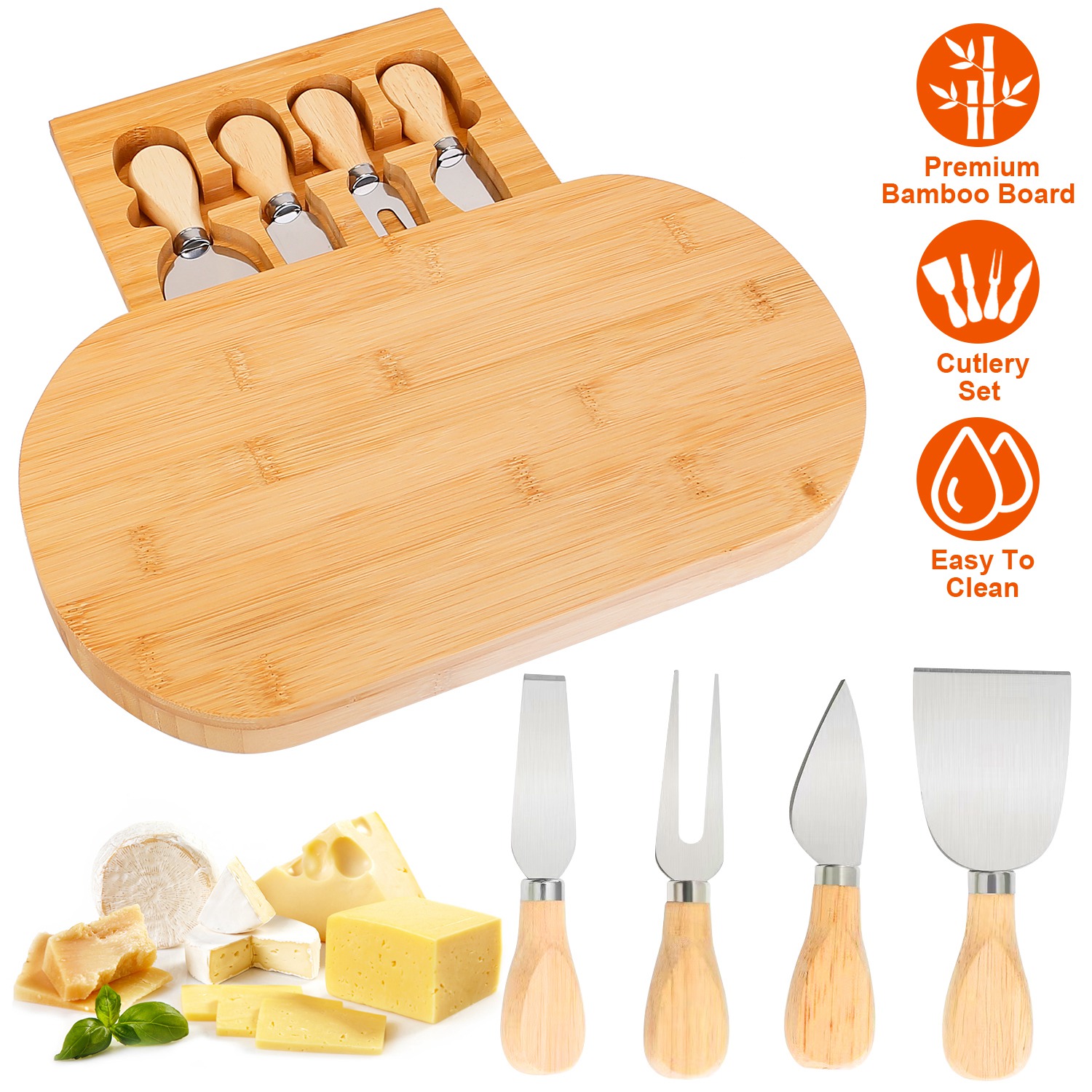 Oval Bamboo Cheese Board Knife Set Wooden Cheese Serving Platter Tray with 4 Stainless Steel Knives Pull-out Storage Drawer for Wedding Birthdays