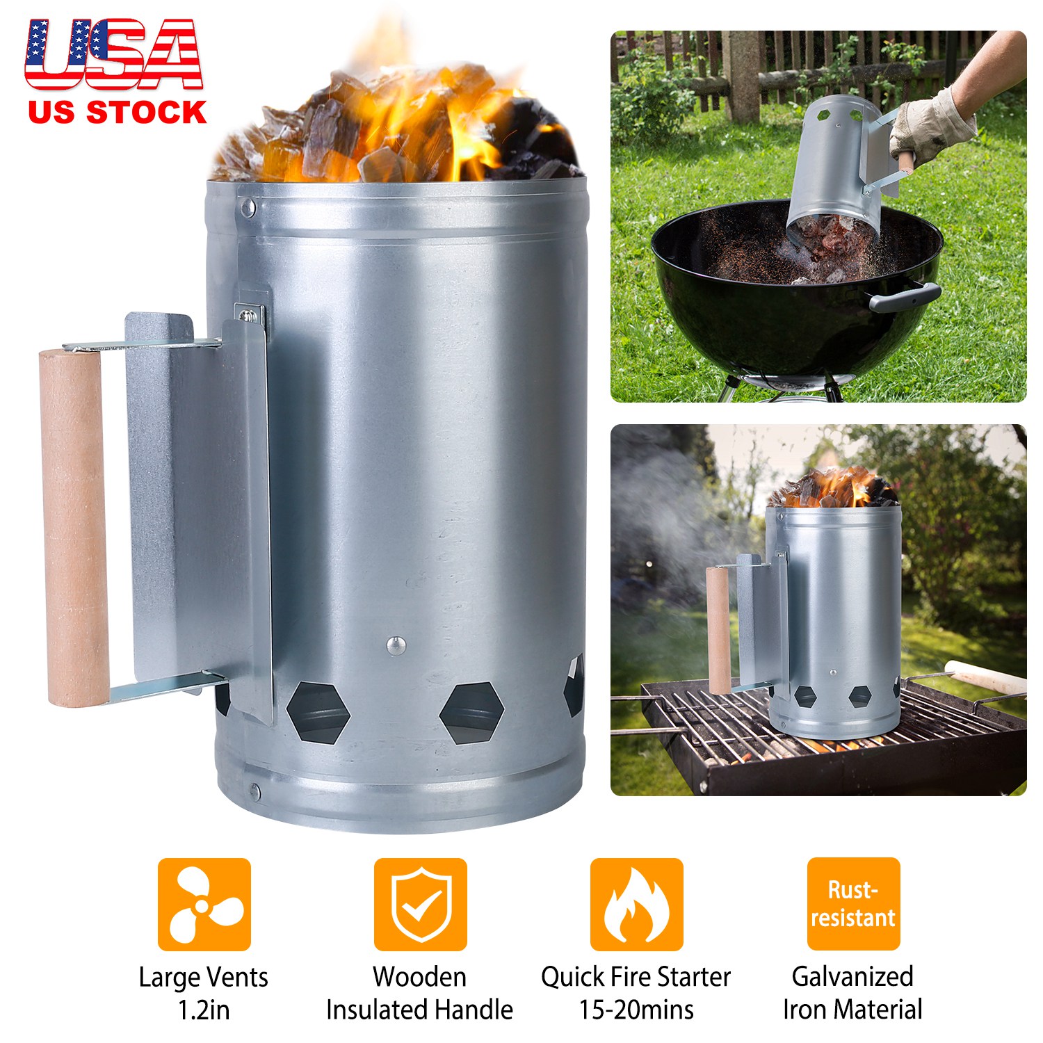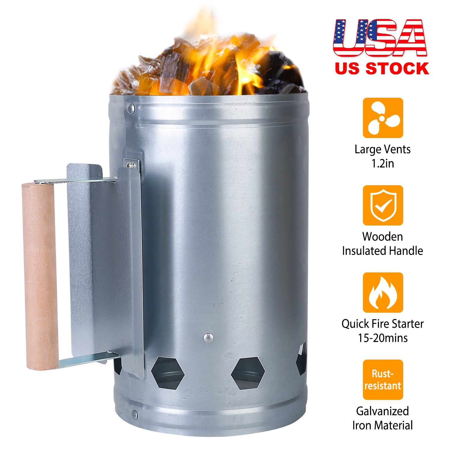 This charcoal starter with large air vents greatly shortens the amount of time to heat up the charcoal. The wooden handle provides protection against heat transfer. This charcoal chimney lighter fits perfectly briquette, charcoal and coal, suitable for outdoor cooking, quick backyard BBQ, tailgate parties, car camping, fish trips, and garden grilling.