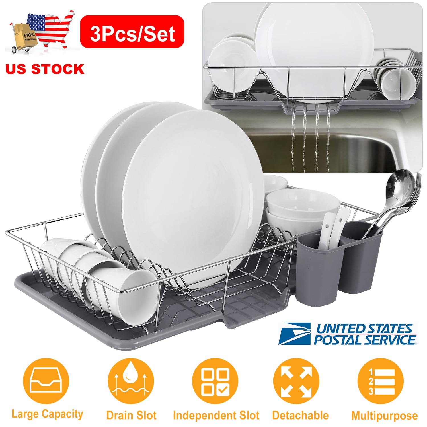 3Pcs Dish Drainer Drying Rack Set Kitchen Dish Rack Countertop Storage Rack w/ Plastic Cutlery Holder Drain Board