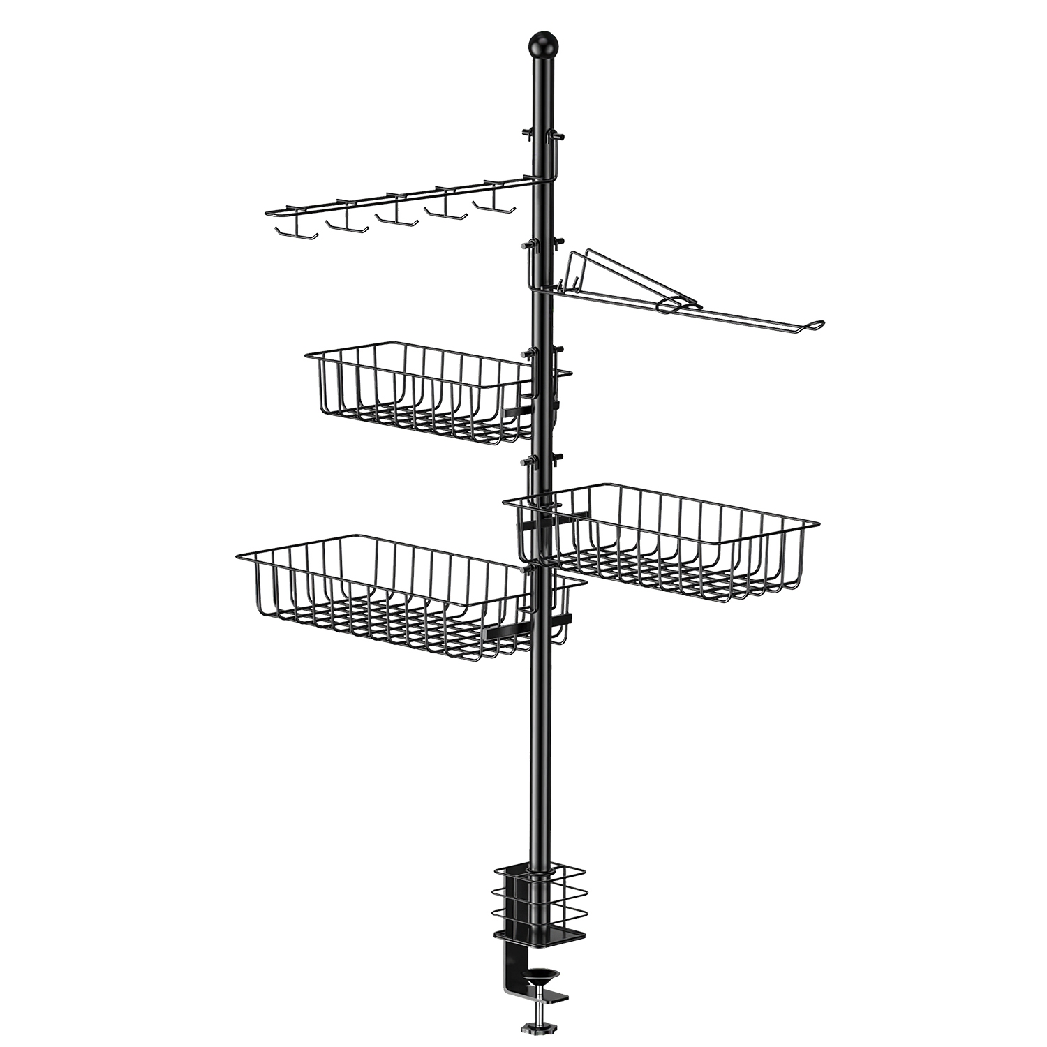 Come with S/M/L baskets for various bottles and cans, dual-row hook with 10 hanging placements for cooking utensils and paper towel holder with weighted arm, our upgraded standing BBQ caddy rack maximizes vertical storage space while saving countertop operating space, providing easy access to everything you need. Made of thickened carbon steel with rustproof powder-coating, our griddle caddy is built to last and can withstand harsh weather conditions. Equipped with a C-shape clamp base, this griddle caddy securely attaches to any Blackstone griddle cooking stations or outdoor tables with thickness under 2.28inches.