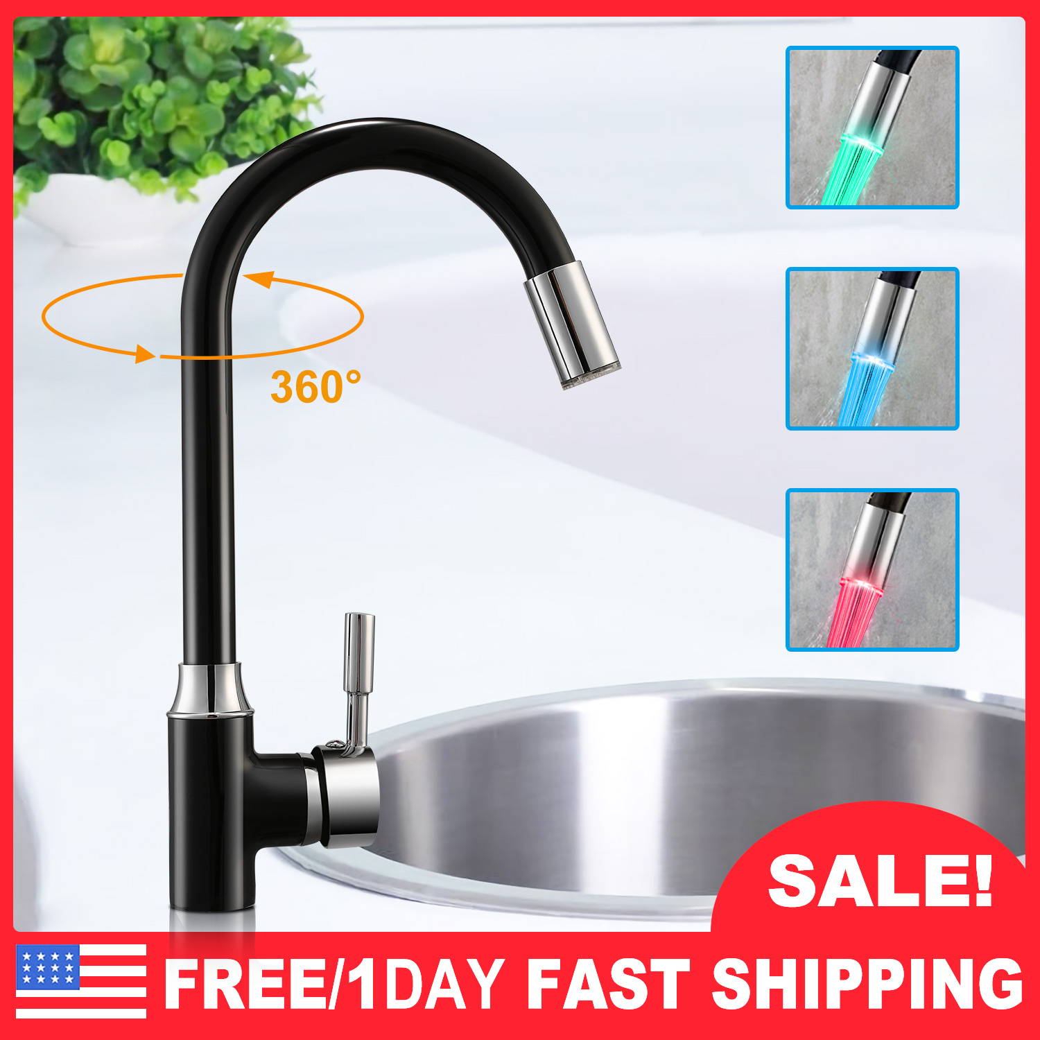 Do you want to enjoy more fun and more colors in your kitchen and bathroom? Our LED water tap can be an amazing choice. Featured with high-sensitive temperature sensor, our LED water tap can change into 3 colors: Water glows blue when water is cold (below 31°C/87.8℉), glows green when water is warm (between 32°C-43°C/89.6℉-109.4℉), glows red when water is hot (between 44°C-50°C/111.2℉-122℉), when water temperature is above 51°C/123.8℉, the light will flash red to warn. Adopted with hydropower technology, the light is powered by water, safe and energy-saving, so don’t worry about the battery changing. The water tap is made of premium copper and the stainless steel, abrasion-resistant, rust-proof and durable. The 360°Rotation faucet can be rotated to any direction, bringing more convenience when using. The mixer tap can be connected to hot and cold water hoses, so you can swivel the tap to adjust the water temperature.